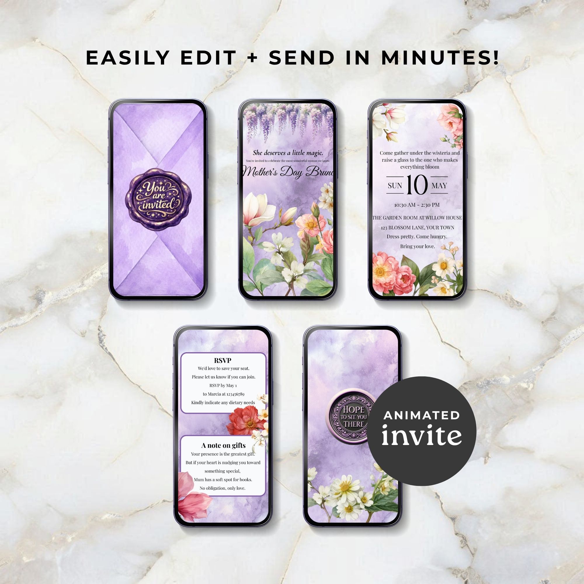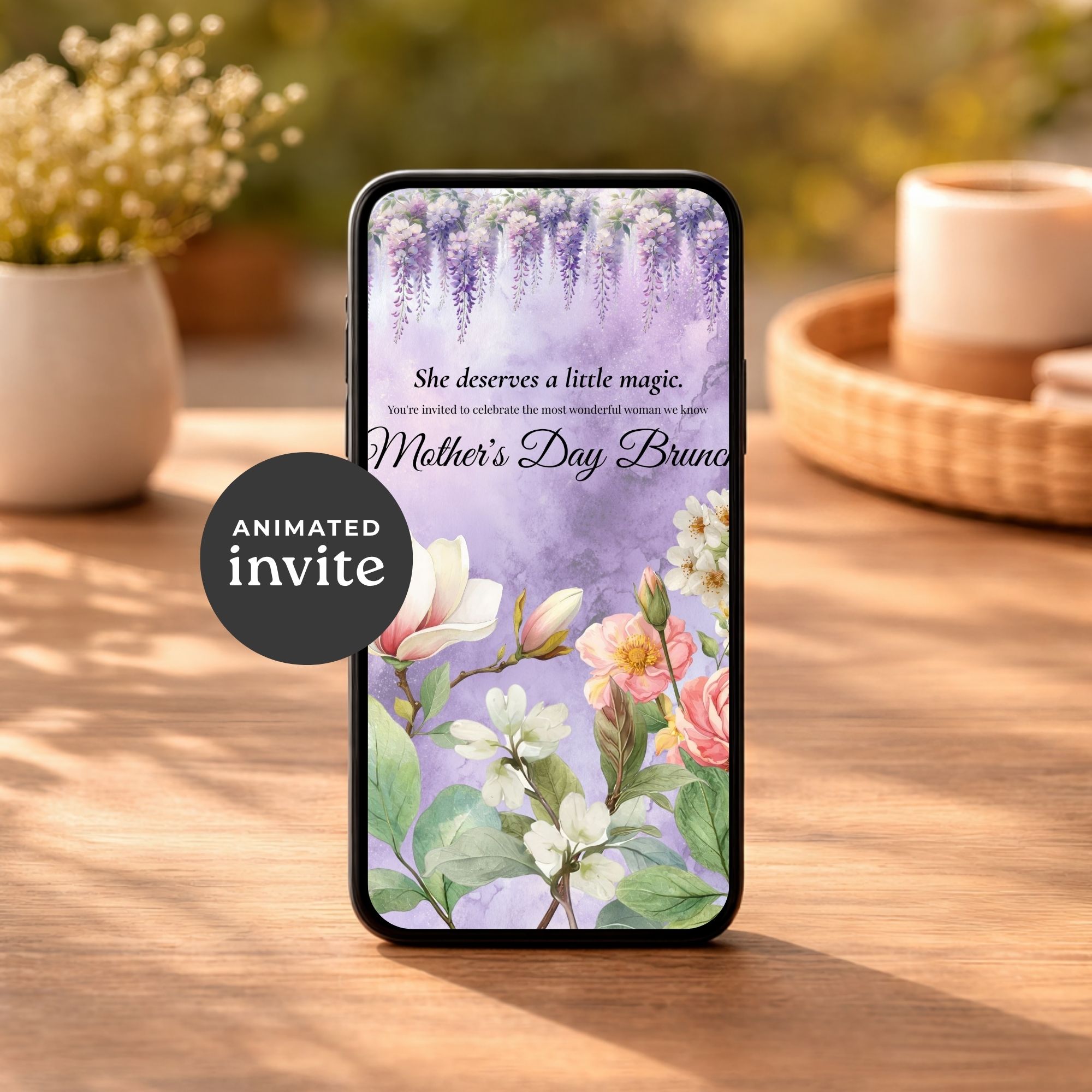 Create a stunning, personalized Mother’s Day brunch invitation in minutes — no design experience needed. This beautiful animated invitation features cascading wisteria, soft watercolour florals, and a romantic fairytale aesthetic that will take her breath away. Check the video tab to see it come to life.