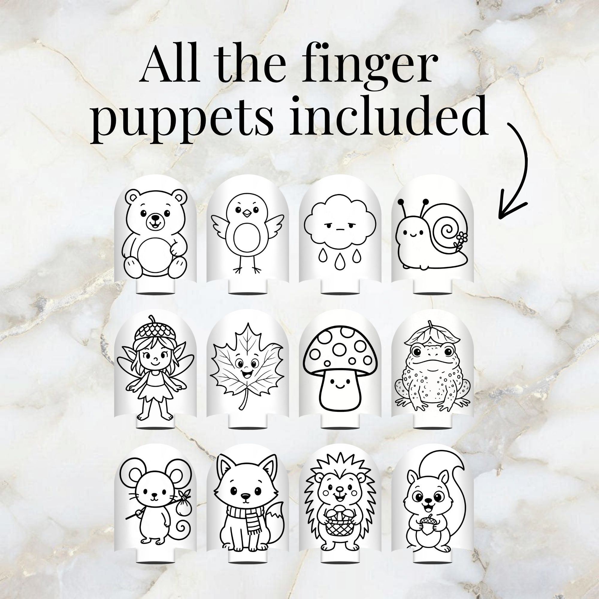 ✅ 12 unique woodland finger puppet characters to colour and cut out