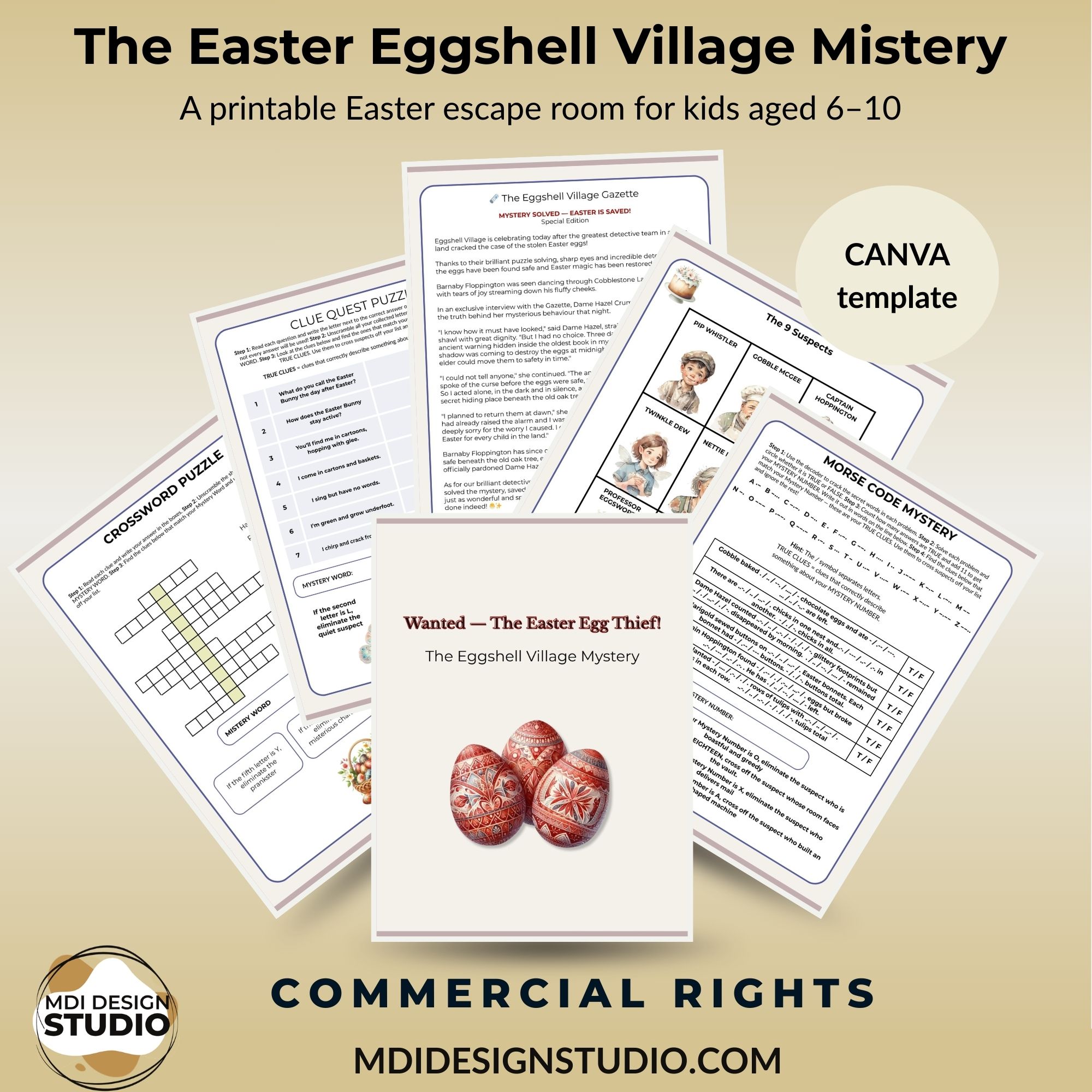 This beautifully designed printable escape room brings together puzzle solving, critical thinking and pure Easter magic in one unforgettable activity. With 9 whimsical suspects and 8 carefully crafted puzzles, your children will decode ciphers, solve riddles and follow clues to unmask the Easter egg thief — one suspect at a time.